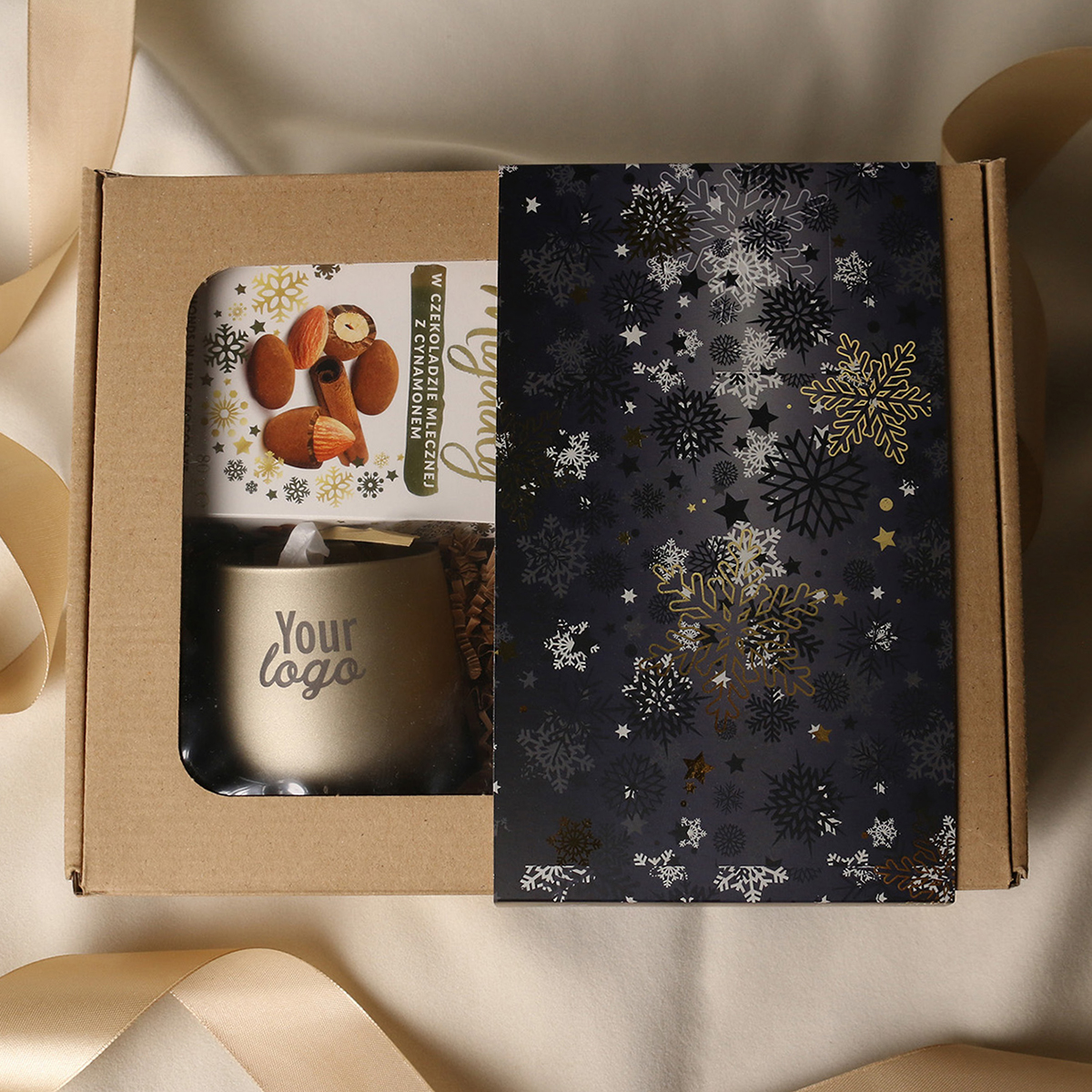 W skład zestawu wchodzą: Lampion Sensitive złoty mat (z t-light'em sojowym) z możliwością zdobienia, Amaresti Pralines- migdały w czekoladzie z cynamonem, zielona herbata Sencha z wiśniami, płatkami róży zapakowana w tubę z motywem zimowym, Luxury Chocolate - Czekolada Belgijska do picia w tubie z motywem zimowym. Całość w stylowym opakowaniu z tektury eco z okienkiem. Opcje dodatkowej customizacji: nadruk na lampionie, bilecik z logo firmy, wstążka lub obwoluta z motywem zimowym wzbogacona złoceniem.